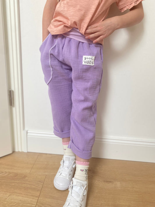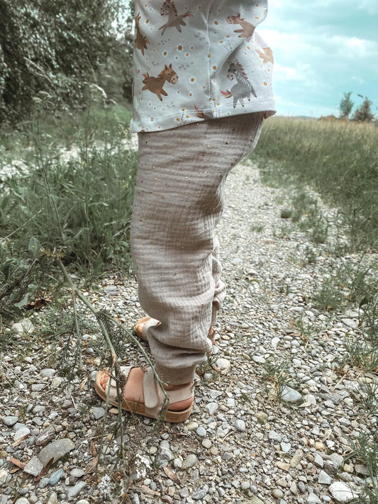 Entdecke meine Musselinhosen, mit denen dein Kind Komfort und Design durch 100 % Baumwolle in vollen Zügen genießen kann. Kindergerechte Motive und eine raffinierte Schnittführung, auf das Mitwachsen ausgelegt, machen die Hose zu einem Lieblingsteil in der Sommergarderobe. Die Hose hat ein gerades und weit geschnittenes Bein, ohne pumpig zu wirken! Sie überzeugt mit einem hohen Schritt, perfekt für Kinder, die den tiefen Schritt nicht mögen. Musselin besitzt wertvolle Eigenschaften. Der Stoff ist strapazierfähig, leicht und atmungsaktiv. Der gewebte Stoff lässt die Luft zirkulieren und senkt somit das Überhitzungsrisiko! Saugstark und zudem schnelltrocknend sind die Hosen vielseitig einsetzbar: am Strand, im Urlaub oder zu Hause im ganz normalen Alltag.