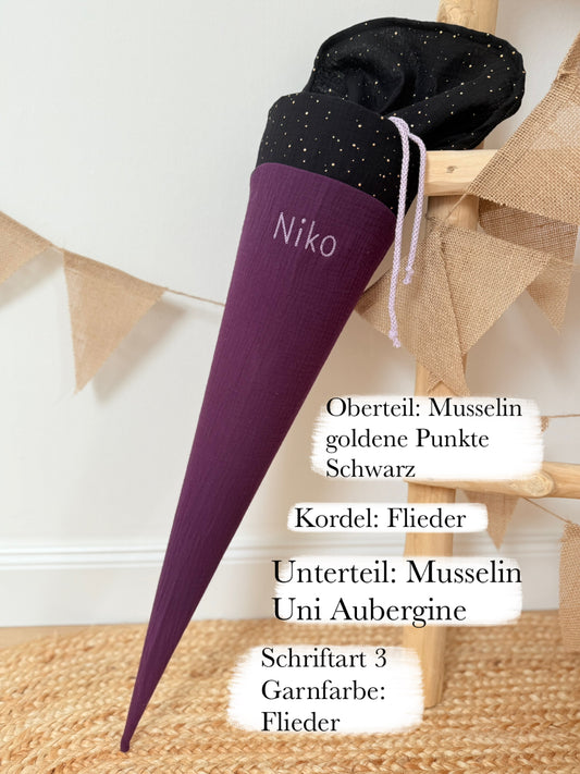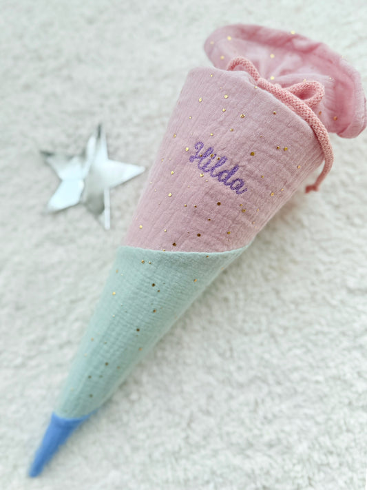 Dein Design Musselin Schultüte, Geschwister- und Kitatüte – viele Farben, gold Punkte, personalisierbar, Kisseninlett optional