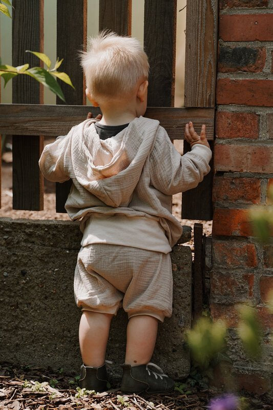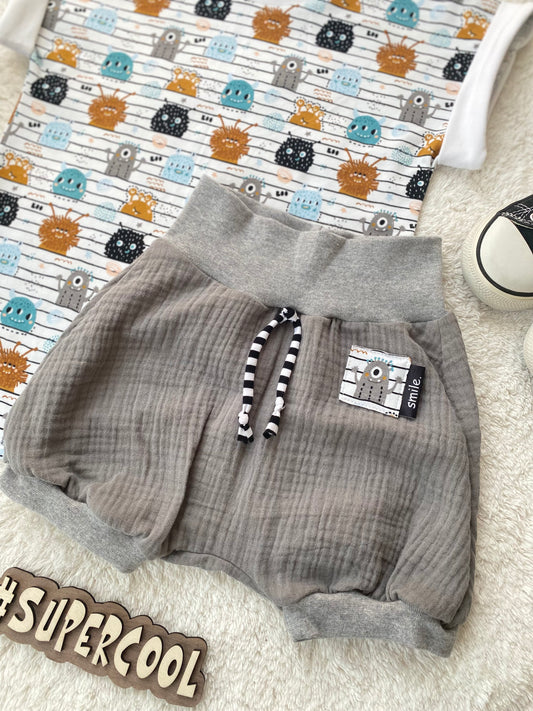 Eine richtig flotte Buxe ist die Shorty-Buxe! Ein extra kurzer Schnitt für den Hochsommer: wenig Stoff, viel Luft! Das einfache hineinschlüpfen in die Shorty fördert das selbstständige Anziehen schon bei den Kleinsten! Keine Knöpfe, keine Reißverschlüsse. Die Shorty Buxe kombiniert Komfort, Style und Nachhaltigkeit!