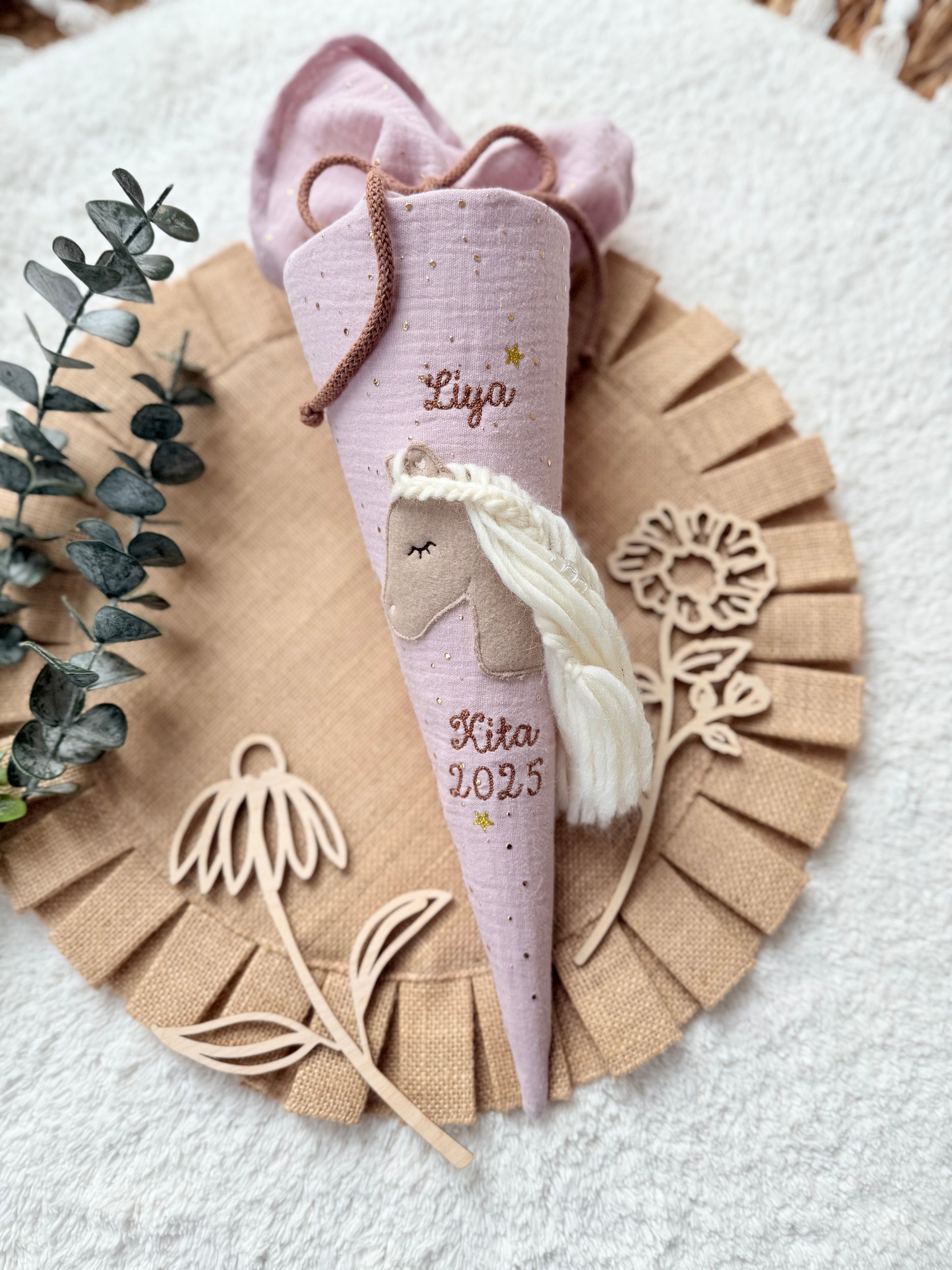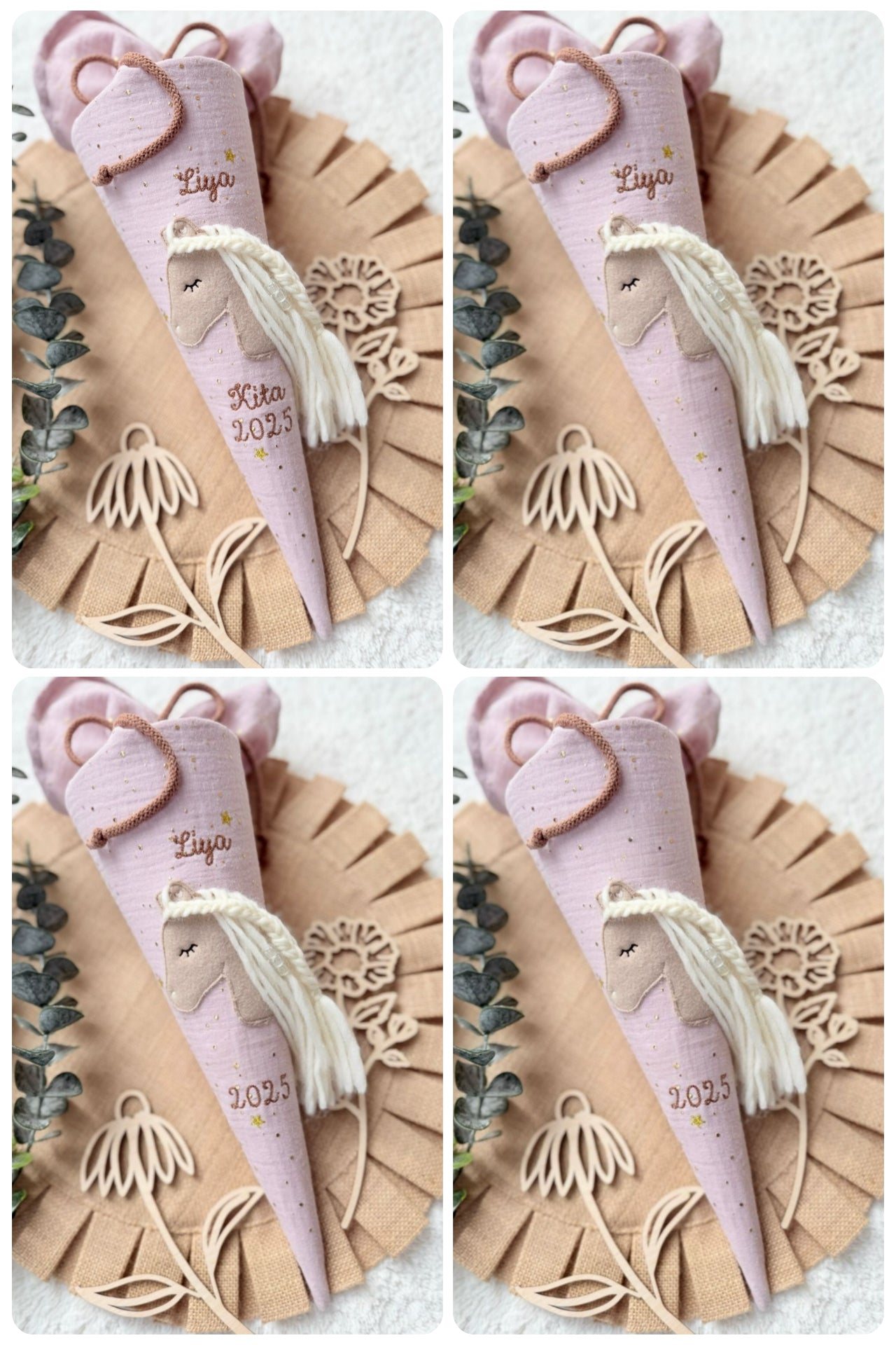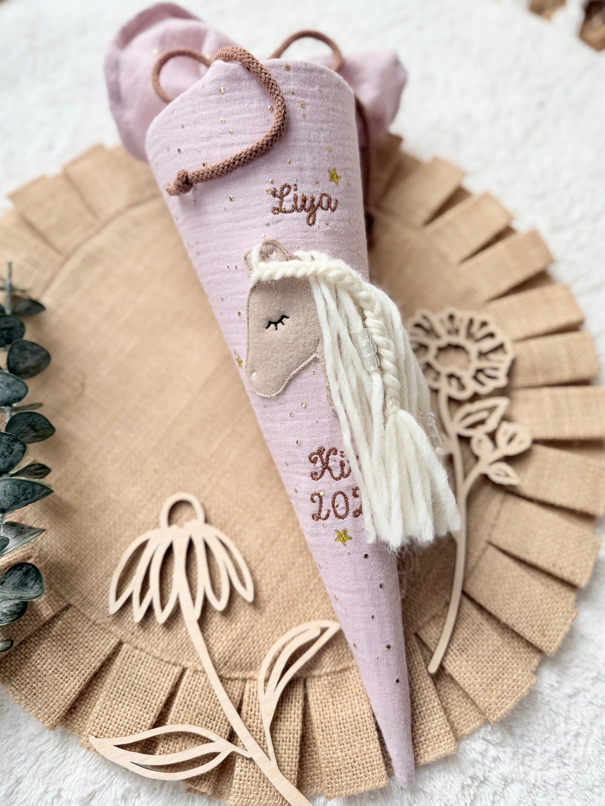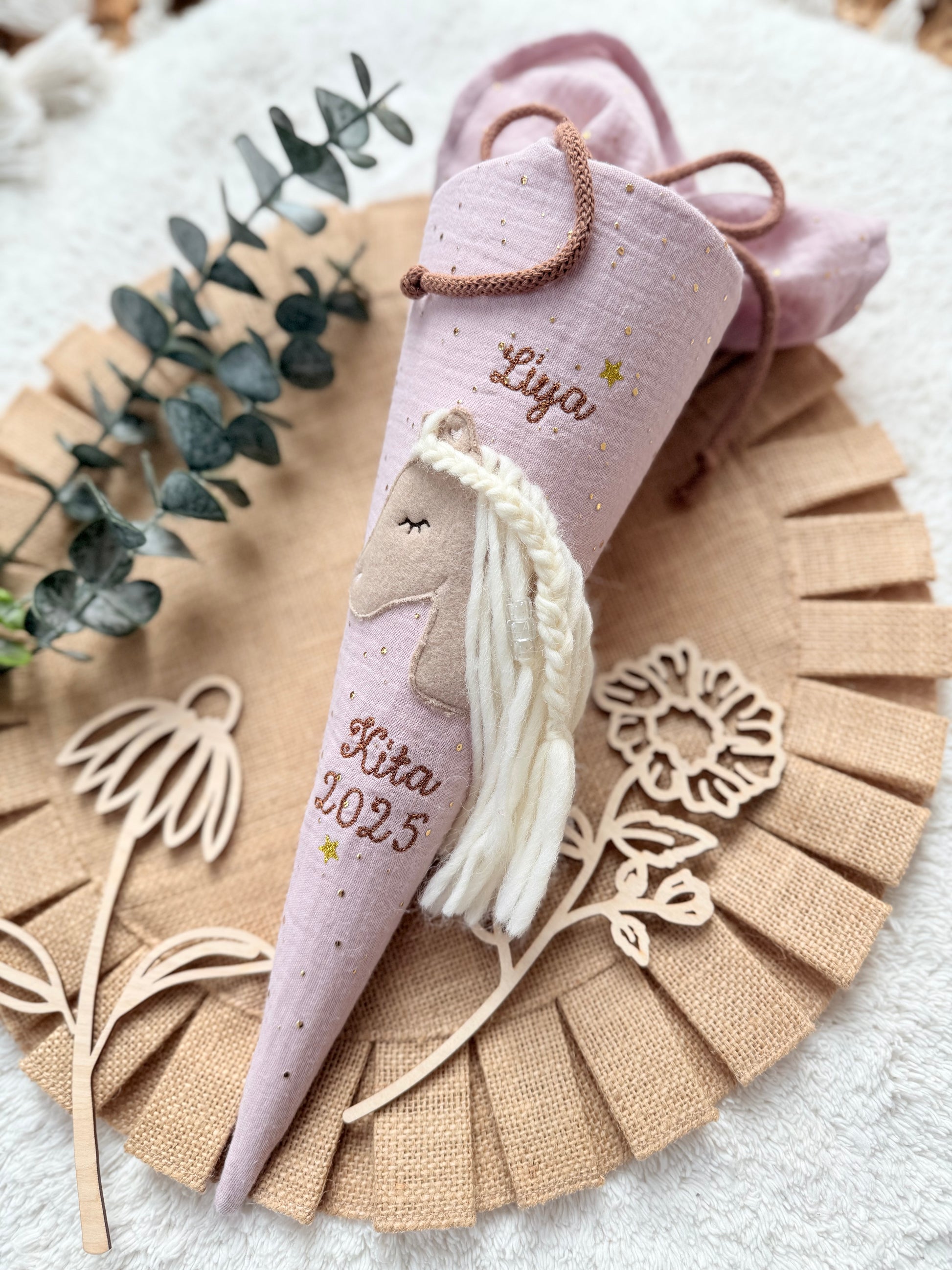 Geschwistertüte 35 cm | Kitatüte | Haflinger | Pony | Fohlen | Musselin mit goldenen Punkten | Kissen Inlett