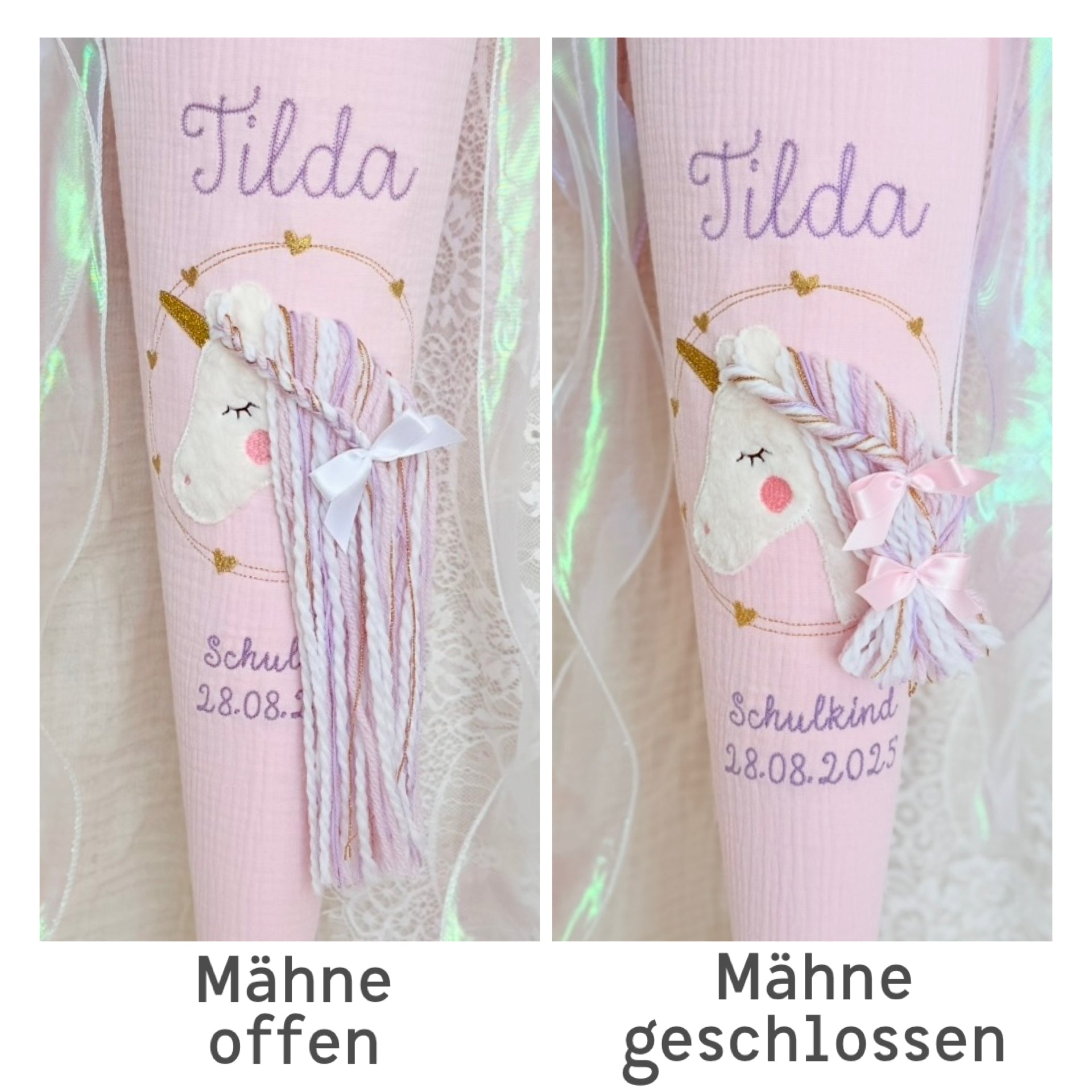 Musselin Schultüte 70 cm Einhorn | Magisches Hologramm | Schleifenband & Kissen-Inlett