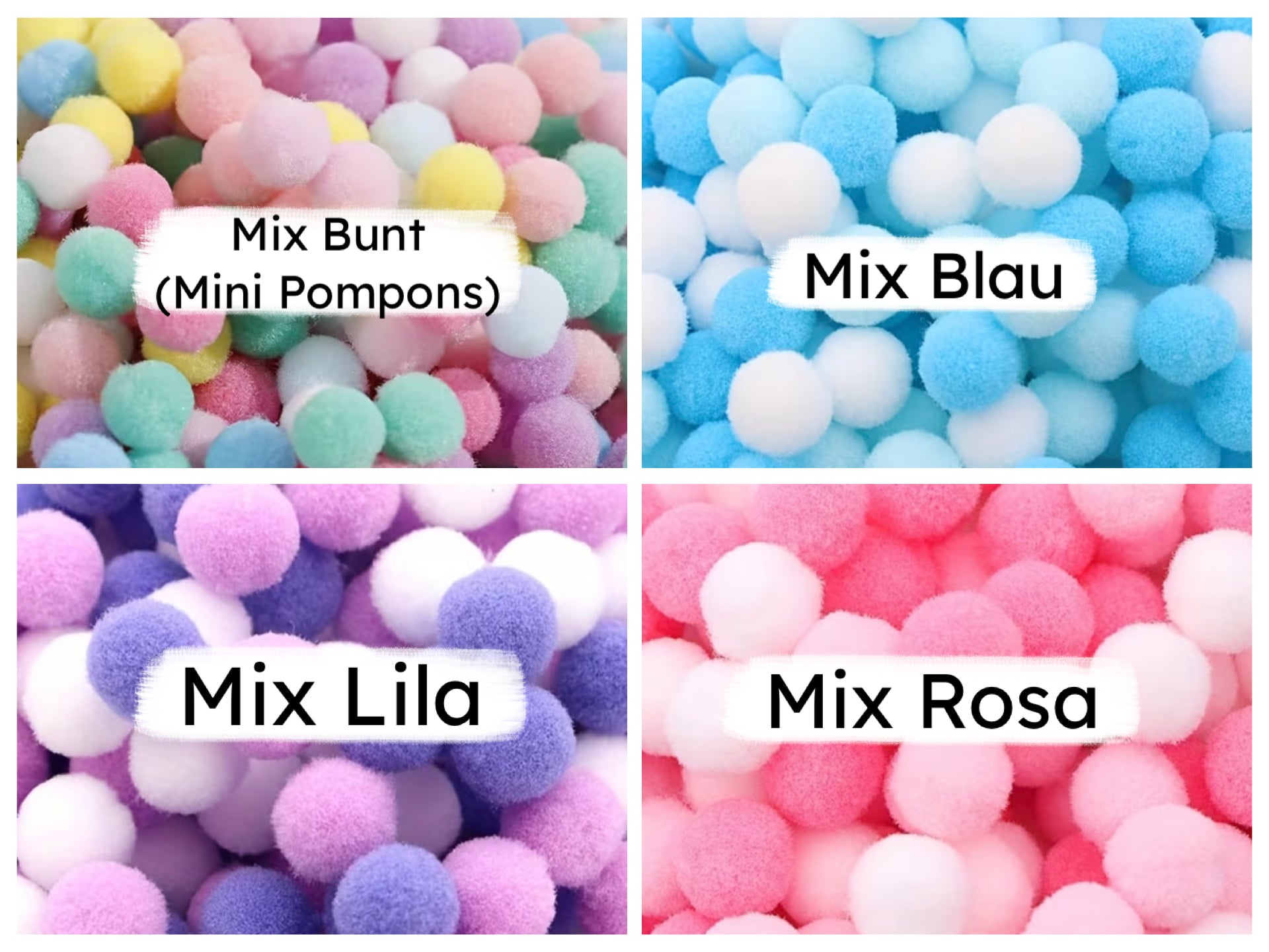 Jede Pompon-Schleife ist ein handgefertigtes Unikat. Die Befüllung kann in Anzahl und Anordnung der Farben leicht vom Produktbild abweichen – ich achte dabei stets auf eine harmonische Optik und eine schöne, volle Füllmenge.