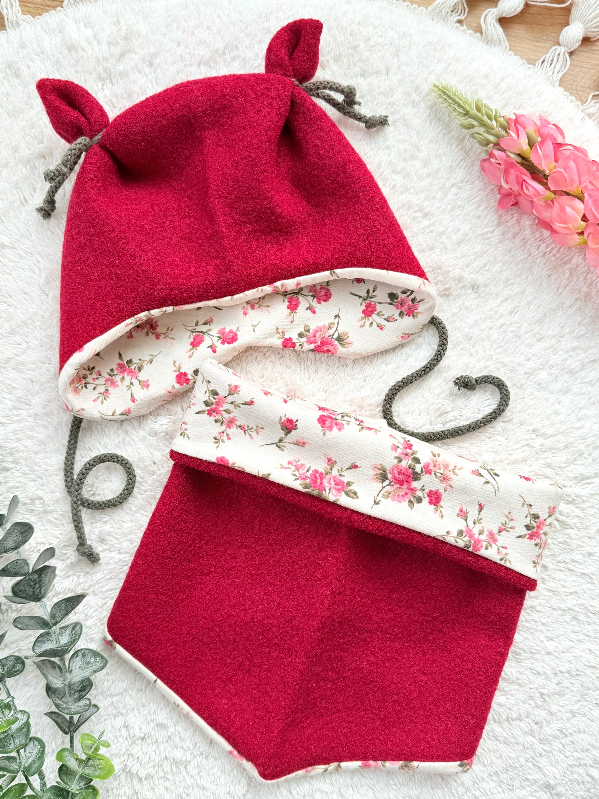 Ein Set bestehend aus Ohrenmütze und Rundschal-Loop, genäht aus Wollwalk mit Baumwolljersey Futter. Die Futterstoffe sind uni oder haben Muster.