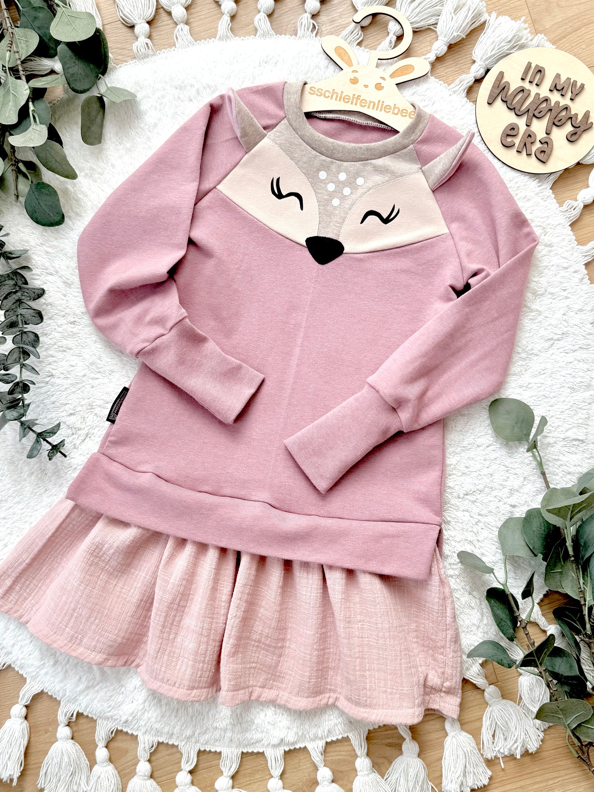 Tunika-Sweatshirt mit Musselin-Volant und Reh-Design. Durch den lockereren Schnitt und den breiten Volantsaum sorgt der Sweater für einen femininen Look und eine leichte Silhouette! Auf das mitwachsen ausgelegt! Lässig und bequem, stylisch zu Jeans, Leggings und Radlerhose! Genäht aus Sommersweat (French Terry) ist das Tunika-Sweatshirt perfekt für das ganze Jahr geeignet.